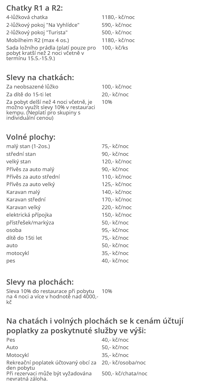 Pro přípravu vlastních jídel je k dispozici společná Kuchyňka, můžete si sebou vzít nádobí, na které jste zvyklí. Lůžkoviny Vám budou vydány při nástupu spolu s klíči. Všechny chatky mají el. zásuvky. Parkování většinou u chatky jinak v areálu.