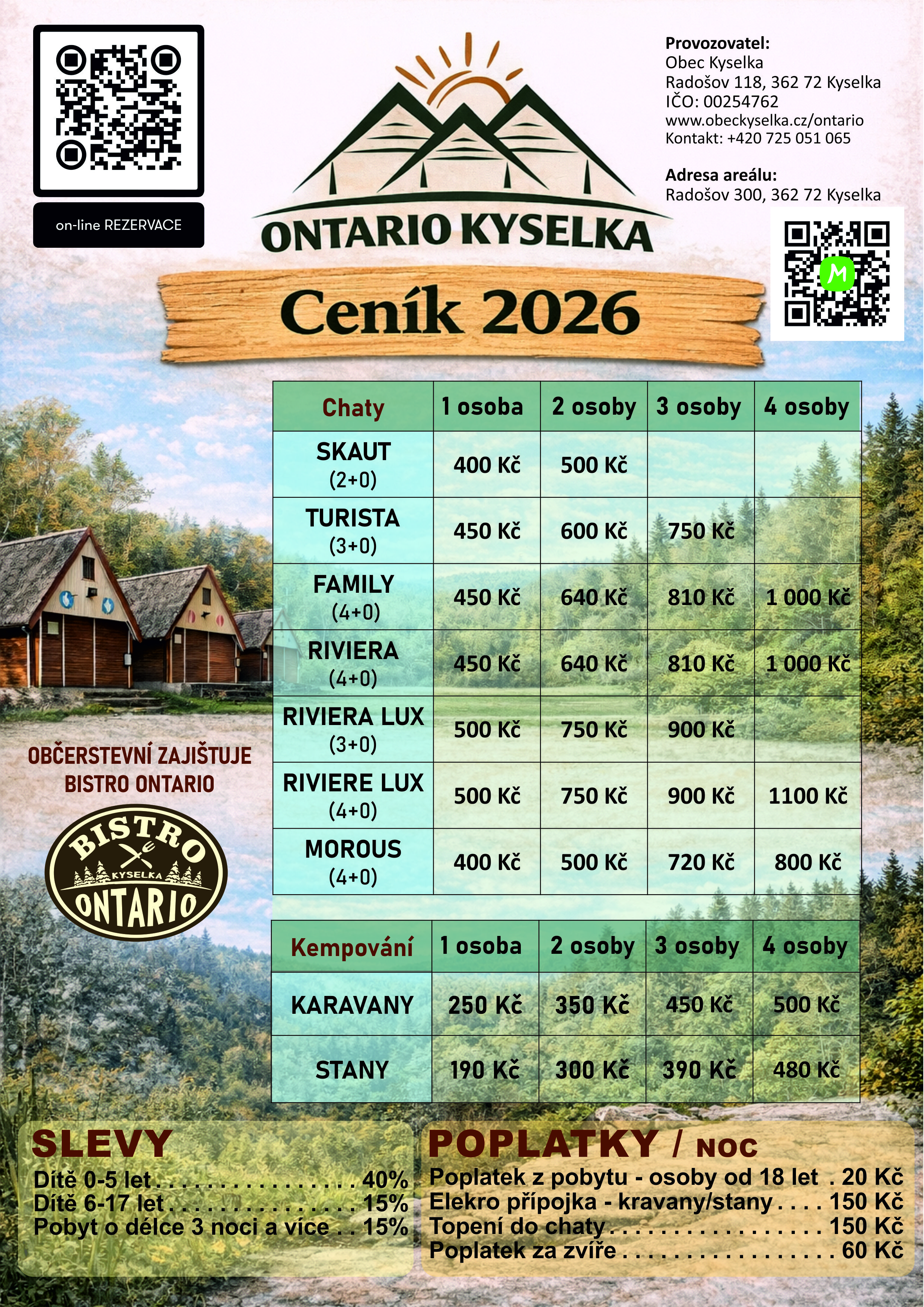 „Rekreační volnočasový areál Ontario je po mnoha letech zpět ve správě obce Kyselka a od roku 2021 prochází postupnou obnovou. Jedná se o klidné a jedinečné místo zasazené do krásné přírody. Kromě klasického kempování a ubytování v chatkách bude areál sloužit pro letní dětské tábory, firemní a spolkové akce, svatby, koncerty a další společenské a kulturní akce. ”