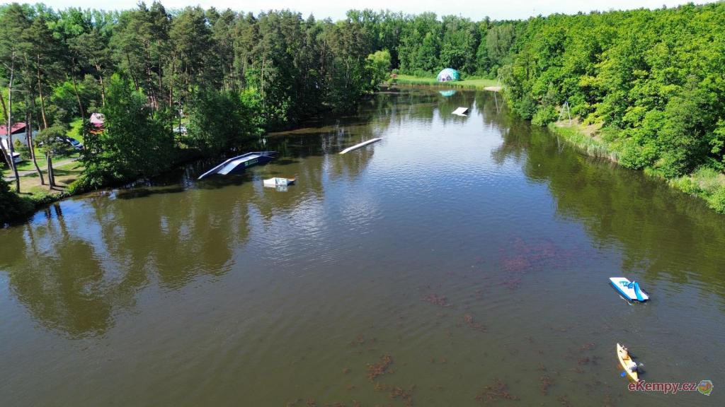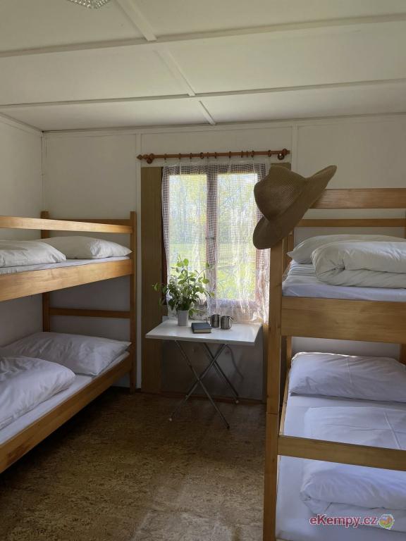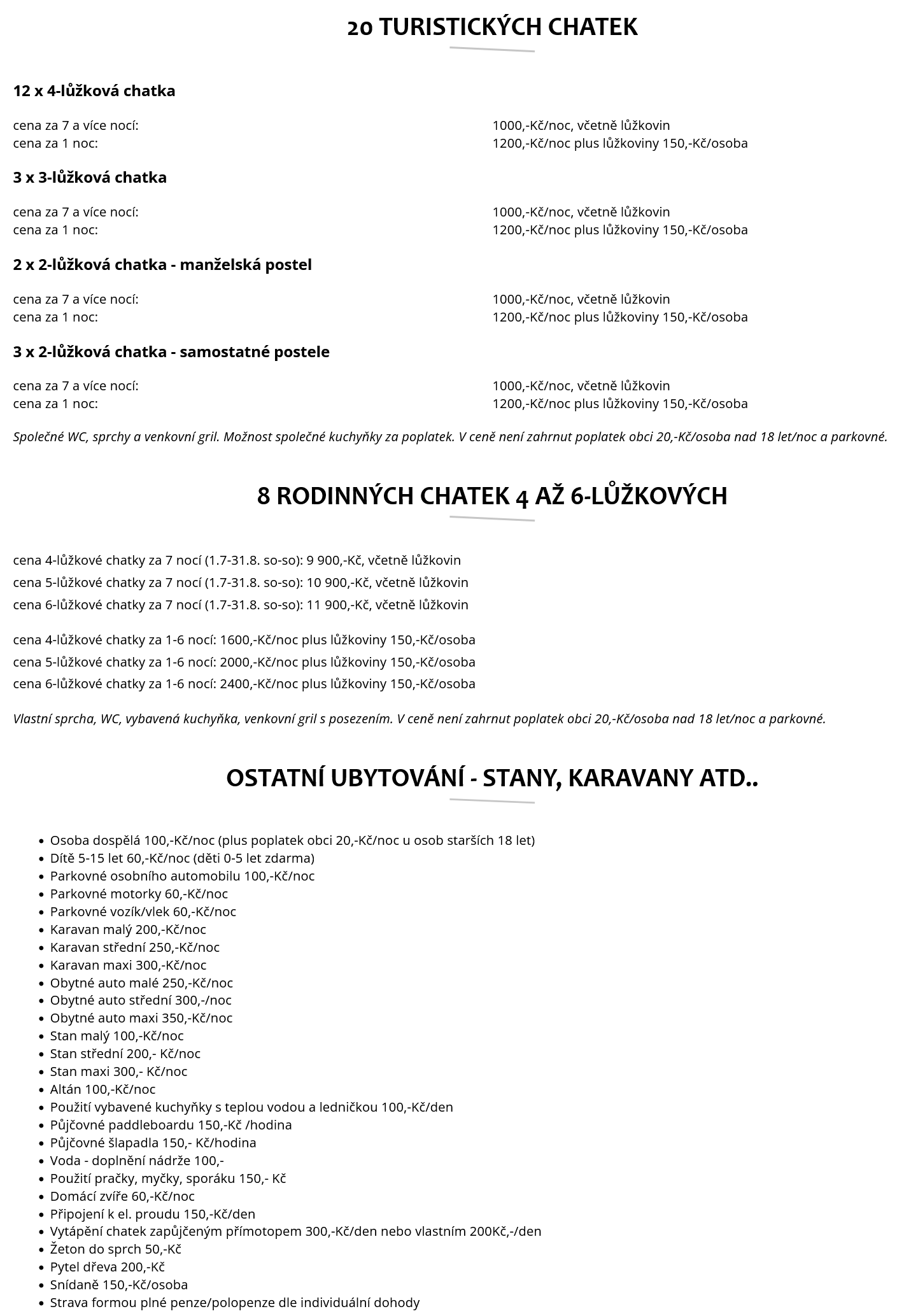 🛖 20 turistických 2/3/4L chatek: Společné WC, sprchy a venkovní gril. Možnost společné kuchyňky za poplatek.