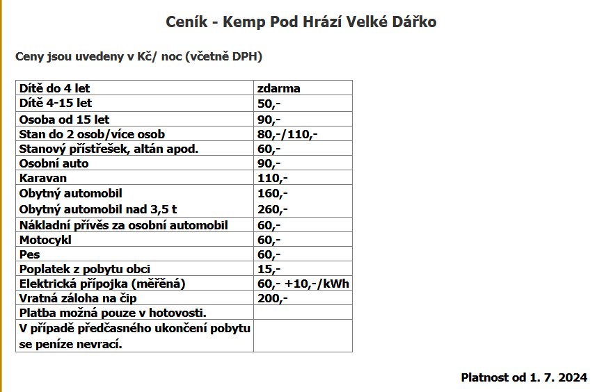 Vítáme klienty všech věkových kategorií v novém kempu přímo u nádrže Velké Dářko na Vysočině, jsme zařízeni i pro hosty s tělesným handicapem. Máme místa pro stany a karavany s el.přípojkou. K pláži nebo občersvení je to jen několik metrů a uprostřed kempu je k dispozici nové sociální zařízení. V zadní části se nachází klidnější zóna pro rodiny s dětmi a přední část uvítají hosté, kteří chtějí mít blíž k vodě a k občerstvení. Čisté nové sociální zařízení, kde teplá voda nikdy nedojde.