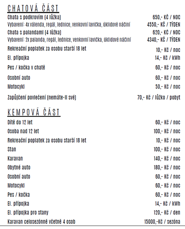 Nabídka občerstvení:K občerstvení je tu několik stánků, restaurace Koliba s venkovním posezením a také prodejna základních potravin. Hosté mohou využít také možnosti plné penze či polopenze.