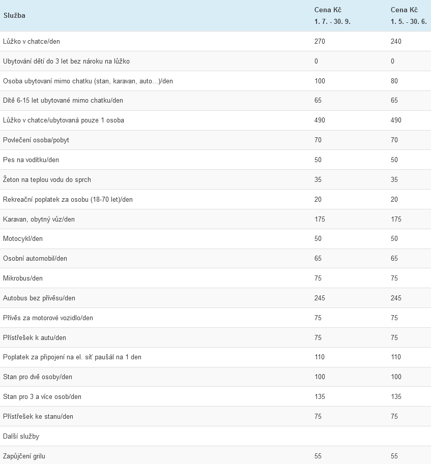 Pro hosty je připraveno 20 nových 4L chatek s nábytkem, lednicí a varnou konvicí. Kuchyňka je vybavena mikrovlnkou, el. sporákem, velkou lednicí, dřezy a základním kuchyňským nádobím.