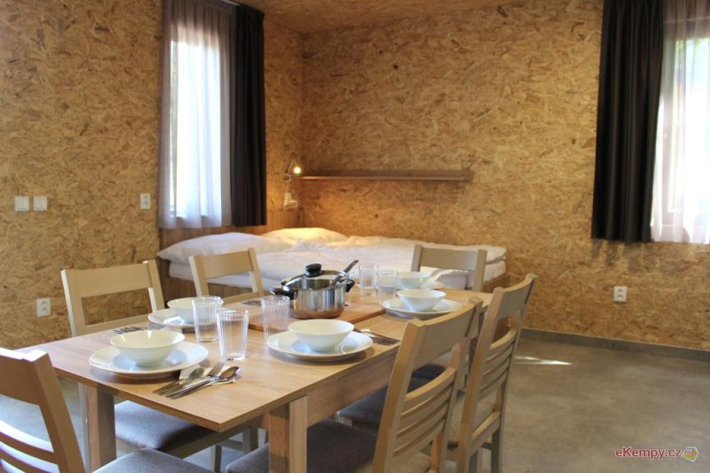 🛖 Ubytovat se také můžete v 2x 4L a 1x 6L chatce s terasou, vlastním sociálním zařízením, palandami a kuchyňkou.