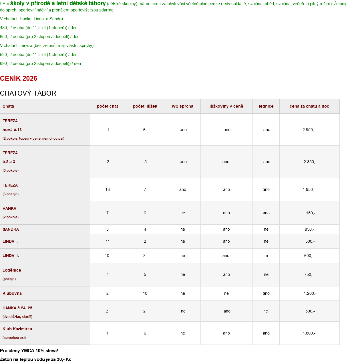 🛖🏡 Táboru dominují chaty Tereza (16). Jsou sedmilůžkové s celkovou kapacitou 111 osob. Patrové chaty mají vlastní WC a koupelnu se sprchovým koutem a umyvadlem. Jedna z nich (č.13) je po rekonstrukci a je jenom šestilůžková. O to je ale hezčí a má větší koupelnu a zastřešenou verandu. Malé chatky Linda (21x) mají dvě nebo tři lůžka. Chaty Hanka (7x) jsou nabízeny v šestilůžkové úpravě. Kapacitu tábora ještě rozšiřují tři chaty Sandra, vždy se čtyřmi lůžky. Ubytovaným v chatách Linda, Hanka a Sandra slouží společné sociální zařízení (sprchy, umyvadla) ve třech samostatných zděných budovách, jedna úplně nová.