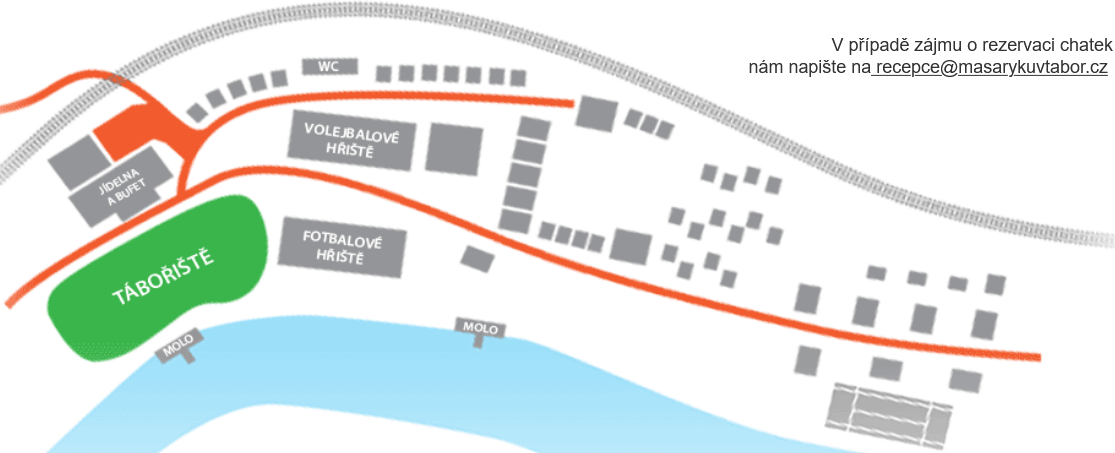 👉 V Masarykově táboře je k dispozici několik sportovišť. Kromě už vzpomínané louky je možnost vyžití na volejbalových kurtech (antuka). Na své si přijdou také příznivci tenisu (asfalt), stolního tenisu a pochopitelně pohybu ve spojení s řekou (loděnice).