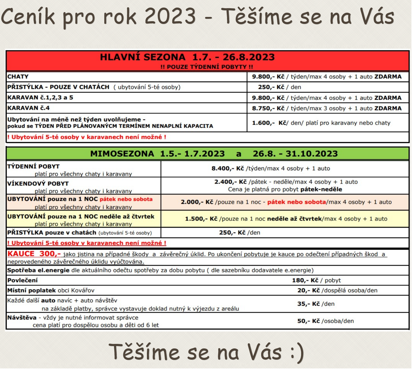 Samotný areál Rekreačního střediska RADAVA je zajímavě situovaný svou polohou uprostřed lesíku. Chaty i karavany jsou ukryté ve stínu stromů, které umožňují příjemný odpočinek, což zvláště v parných letních dnech naši rekreanté oceňují.