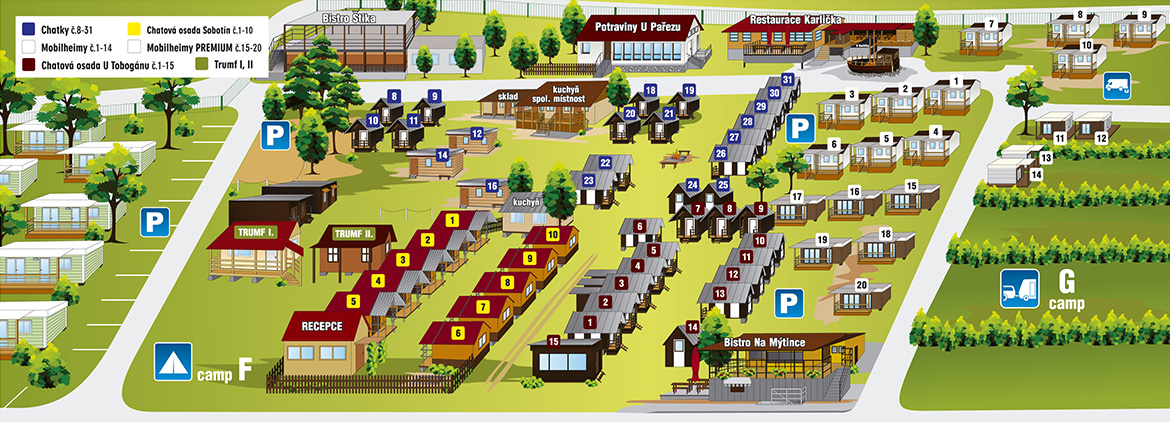 👉Zde můžete objednat i kempové místo pro karavan nebo stan, dále 2/4L pokoje, 2L apartmány v pensionu, vše je poblíž v areálu.