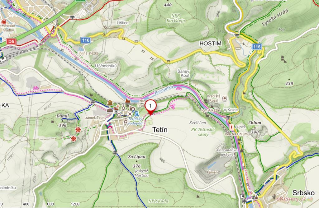 Stellplatz Tetín se nachází za fotbalovým hřištěm (příjezd ulicí Hájka z Libočan, GPS souřadnice: 49.9486569N, 14.1101192E) a celkem zahrnuje 8 karavanových stání.