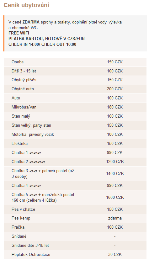 Kemp nabízí levné, ale čisté a pohodlné ubytování v dosahu 15km od Brna. V našem rodinném kempu se setkáte s osobním přístupem k zákazníkovi. Standardem je sociální zařízení s teplou vodou, kuchyňka, dětské hřiště a trampolína pro děti. Domácí mazlíčci jsou u nás vítáni. Nově jsme vybudovali příjemné prostředí kavárny s minikavárničkou pro děti. Pochutnat si můžete na čerstvě pražené kávě z lokální pražírny, vynikajících dezertech a zakousnout se do čerstvých toastů či panini. Na přání Vám nachystáme snídani i večeři. V letních dnech nabízíme točené pivo, výborné limonády, fresh juicy nebo milkshaky. V okolí se nachází hrad Veveří, přírodní koupaliště v Říčanech a druhé největší město v ČR, Brno.